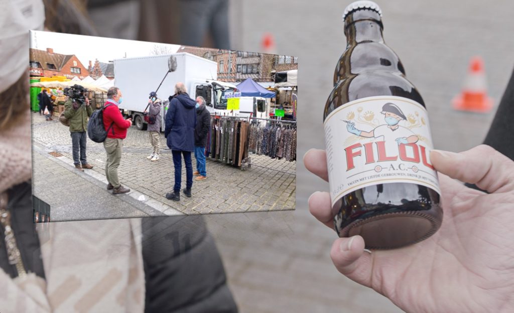 Wanneer de meerderheid van de marktbezoekers zich zorgen blijkt te maken over de huidige vaccinatiestrategie, en de blijvende sluiting van de horeca omschrijft als een zwaar sociaal gemis, schotelt reporter van dienst Sam Louwyck hen met opperste sérieux een alternatief voor. Dat alternatief blijkt recht van de productieband van lokale brouwerij Vanhonsebrouck te komen, waar ze er in het grootste geheim in slaagden het vaccin te mengen met bier, aldus de reporter. Uit die geslaagde test ontstond ‘Filou AC’ oftewel Filou Anti-COVID. Eén flesje bier bevat één dosis van het coronavaccin; dus je hebt er twee nodig om safe te zijn. “Een win-win situatie voor iedereen”, zo staat Marc Van Ranst de reporter van deskundige uitleg bij. Het productietekort kan opgevangen worden door de brouwerij en door het vaccin in bier te verwerken kan de horeca heropenen als officiële vaccinatiecentra. “Maar dat is lang niet alles”, vervolgt Van Ranst, “In plaats van een vaccinatiestrategie die de overheid handenvol geld kost, brengt dit alternatief de staatskas net geld op via alcoholaccijns. En vaccinweigeraars zijn weinig waarschijnlijk, want zeg nu zelf, welke Vlaming slaat een pintje af?”. De nieuwsploeg heeft ook al een eerste lading dosissen bij, en die zien er heel geloofwaardig uit. Zo geloofwaardig dat de meerderheid van de omstaanders lijkt mee te gaan in de grap. “Geen spuitje meer, maar een flesje bier? Zijn er al genoeg in voorraad?” geeft een van de omstaanders aan. “Amai, en op welke temperatuur moeten we dat dan bewaren meneer Van Ranst” aldus een andere – iets meer bezorgde – omstaander. En dan zijn er nog opvallend veel Izegemnaars die dit een geweldig initiatief vinden, en meteen vragen of dit binnenkort ook in wijn- en cavavorm beschikbaar wordt. Dat humor gezond – en zelfs noodzakelijk – is blijkt wanneer iedere geïnterviewde na opname duidelijk word gemaakt onderdeel te zijn geweest van een poging om het algemene sentiment wat positiever te trekken én duidelijk te maken dat we pas allemaal terug van een pintje kunnen genieten als we ons samen laten vaccineren en deze periode nog even doorwinteren. Het gros van de marktbezoekers schiet meteen in de lach. Eén ervan beticht Van Ranst een dubbelganger van de echte te zijn, terwijl een ander de viroloog omschrijft als “een even grote filou als het biermerk zelf, maar wel een filou met het hart op de juiste plaats.”